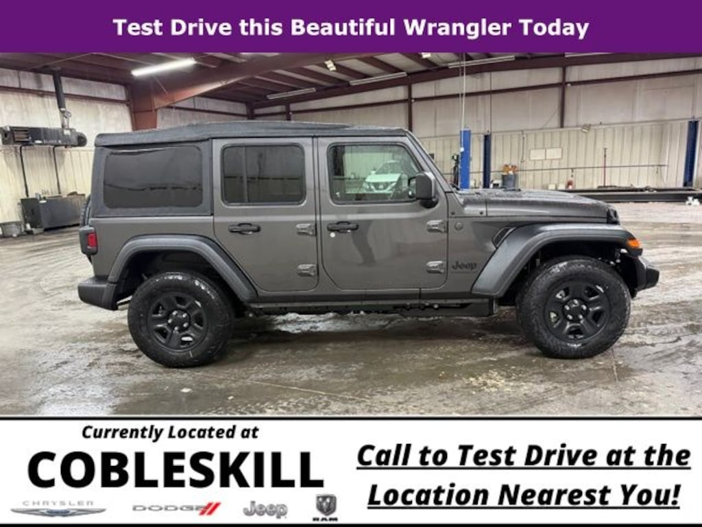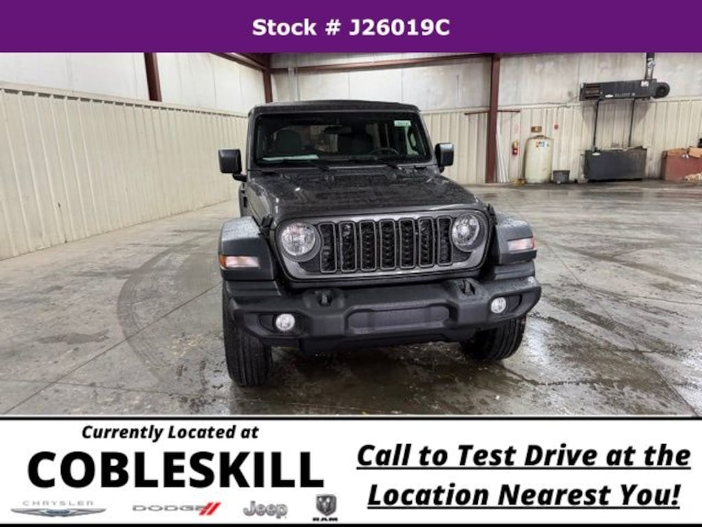Granite Crystal Metallic Clearcoat 2026 Jeep Wrangler Sport 4WD 8-Speed Automatic 2.0L I4 DOHC Save Time at the Dealership by Customizing your Deal Online!, 12.3" Touchscreen Display, 3.45 Overall Top Gear Ratio, 4-Wheel Disc Brakes, 4G LTE Wi-Fi Hot Spot, 8 Speakers, ABS brakes, Air Conditioning, AM/FM radio: SiriusXM with 360L, Apple CarPlay, Apple CarPlay/Android Auto, Aux Battery, Brake assist, Compass, Connectivity - US/Canada, Deep Tint Sunscreen Windows, Delay-off headlights, Driver door bin, Driver vanity mirror, Dual front impact airbags, Dual front side impact airbags, Electronic Stability Control, For More Info, Call 800-643-2112, Front anti-roll bar, Front Bucket Seats, Front Center Armrest w/Storage, Front fog lights, Front reading lights, Google Android Auto, Illuminated entry, Integrated Center Stack Radio, Integrated roll-over protection, Low tire pressure warning, MOPAR All-Weather Floor Mats, Non-Lock Fuel Cap Without Discriminator, Normal Duty Suspension, Occupant sensing airbag, Outside temperature display, Overhead airbag, Panic alarm, ParkView Rear Back-Up Camera, Passenger door bin, Passenger vanity mirror, Power steering, Power windows, Quick Order Package 22B Sport, Radio data system, Radio: Uconnect 5 with 12.3" Display, Rear anti-roll bar, Rear reading lights, Remote keyless entry, SiriusXM Radio Service, SiriusXM with 360L, Speed control, Split folding rear seat, Steering wheel mounted audio controls, Stop-Start Dual Battery System, Tachometer, Telescoping steering wheel, Tilt steering wheel, Traction control, Trip computer, Variably intermittent wipers, Wheels: 17" x 7.5" Black Steel Styled.