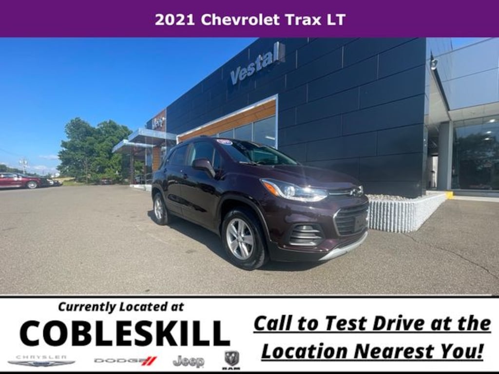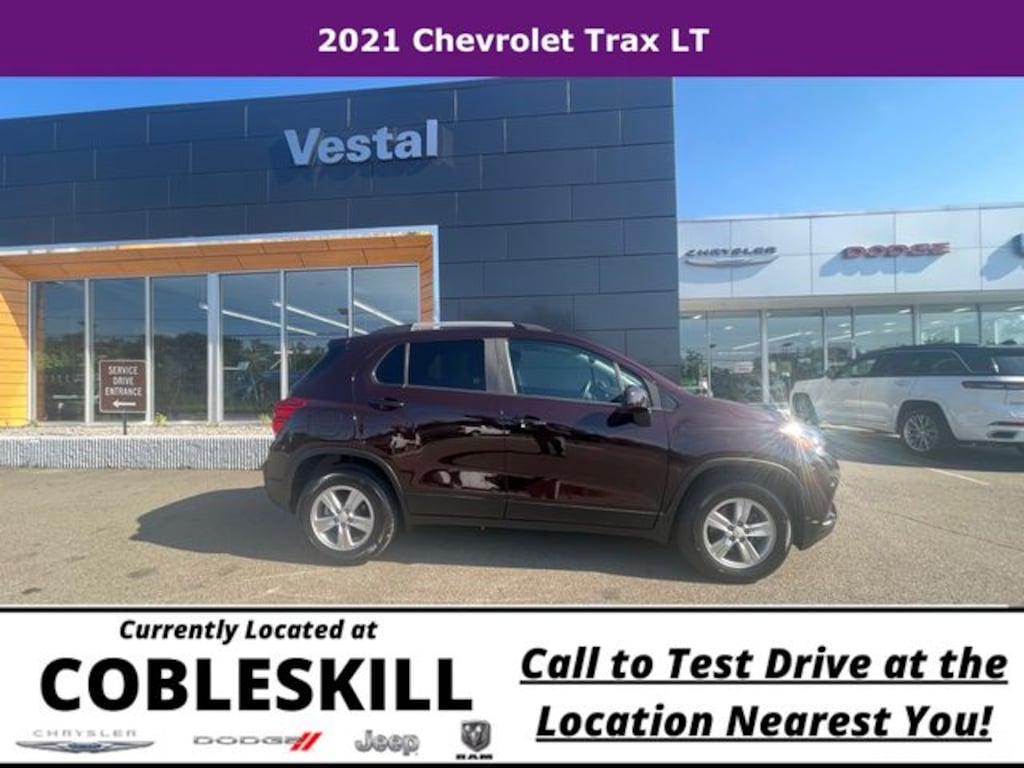 Save Time at the Dealership by Customizing your Deal Online!, 16" Aluminum Wheels, 2 Spare Keys Key System, 2 USB Ports w/Auxiliary Input Jack, 2-Way Manual Front Passenger Seat Adjuster, 3-Spoke Leather-Wrapped Steering Wheel, 3.53 Final Drive Axle Ratio, 4-Way Manual Driver Seat Adjuster, 4-Wheel Disc Brakes, 6 Speakers, 6-Speaker Audio System Feature, 6-Way Power Driver Seat Adjuster, ABS brakes, Air Conditioning, All-Wheel Drive Chassis, Alloy wheels, AM/FM radio: SiriusXM, Apple CarPlay/Android Auto, Black Bowtie (LPO), Brake assist, Bumpers: body-color, Compass, Delay-off headlights, Deluxe Cloth/Leatherette Seat Trim, Driver door bin, Driver vanity mirror, Driver's Seat Mounted Armrest, Dual front impact airbags, Dual front side impact airbags, Electronic Stability Control, Emergency communication system: OnStar and Chevrolet connected services capable, Exterior Parking Camera Rear, Front anti-roll bar, Front Bucket Seats, Front Bucket Seats w/Driver Power Lumbar, Front License Plate Bracket, Front reading lights, Front wheel independent suspension, Fully automatic headlights, Heated door mirrors, Illuminated entry, Keyless Open, Keyless Start, Knee airbag, Low tire pressure warning, LT Convenience Package, Occupant sensing airbag, Outside temperature display, Overhead airbag, Panic alarm, Passenger door bin, Passenger vanity mirror, Power door mirrors, Power steering, Power windows, Preferred Equipment Group 1LT, Premium audio system: Chevrolet MyLink, Radio data system, Radio: Chevrolet Infotainment 3 System, Rear seat center armrest, Rear side impact airbag, Rear window defroster, Rear window wiper, Remote keyless entry, Roof rack: rails only, Security system, SiriusXM Radio, Speed control, Split folding rear seat, Spoiler, Steering wheel mounted audio controls, Tachometer, Telescoping steering wheel, Tilt steering wheel, Traction control, Trip computer, Variably intermittent wipers. Odometer is 17289 miles below market average! 2021 Chevrolet Trax 4D Sport Utility LT AWD 6-Speed Automatic Turbo 1.4L VVT DOHC 4-Cylinder DI SIDI Black Cherry Metallic