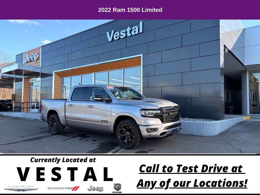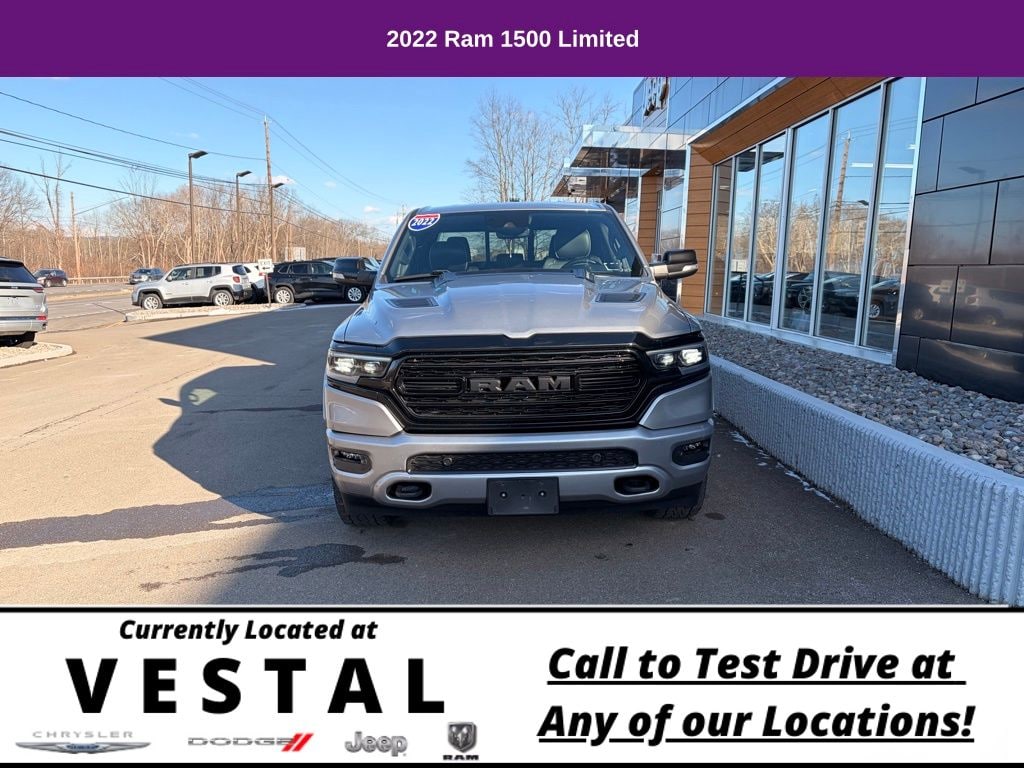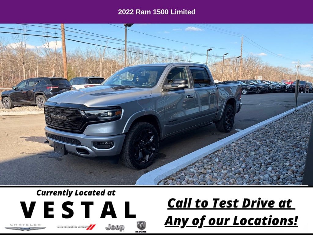 10 Speakers, 4 Way Front Headrests, 4-Wheel Disc Brakes, 48V Belt Starter Generator, ABS brakes, Active Noise Control System, Adjustable pedals, Air Conditioning, Alloy wheels, AM/FM radio: SiriusXM with 360L, Apple CarPlay/Android Auto, Audio memory, Auto High-beam Headlights, Auto-dimming door mirrors, Auto-Dimming Exterior Driver Mirror, Auto-Dimming Exterior Passenger Mirror, Auto-dimming Rear-View mirror, Auto-leveling suspension, Automatic temperature control, Bluetooth, Bodyside moldings, Brake assist, Bucket Seats, Bumpers: chrome, Chrome Exterior Mirrors, Compass, Convex Wide-Angle Mirror Insert, Delay-off headlights, Driver door bin, Driver Seat Memory, Driver vanity mirror, Dual front impact airbags, Dual front side impact airbags, Dual Rear Exhaust w/Bright Tips, Electronic Stability Control, Exterior Mirrors Courtesy Lamps, Exterior Mirrors w/Heating Element, Exterior Mirrors w/Memory, Exterior Mirrors w/Supplemental Signals, Front anti-roll bar, Front Bucket Seats, Front Center Armrest w/Storage, Front dual zone A/C, Front fog lights, Front License Plate Bracket, Front reading lights, Front Seat Back Map Pockets, Front wheel independent suspension, Full Length Premium Floor Console, Fully automatic headlights, Garage door transmitter, Genuine wood console insert, Genuine wood dashboard insert, Genuine wood door panel insert, harman/kardon 19 Speaker Premium Sound, Heated door mirrors, Heated Front Seats, Heated front seats, Heated rear seats, Heated Second Row Seats, Heated Steering Wheel, Heated steering wheel, Heavy-Duty Engine Cooling, HEMI Badge, Illuminated entry, Leather steering wheel, Low tire pressure warning, Manufacturer's Statement of Origin, Memory seat, Navigation System, Night Edition, Occupant sensing airbag, Outside temperature display, Overhead airbag, Overhead console, Panic alarm, ParkView Rear Back-Up Camera, Passenger door bin, Passenger vanity mirror, Pedal memory, Power 4-Way Driver Lumbar Adjust, Power 4-Way Passenger Lumbar Adjust, Power 8-Way Driver & Passenger Seats, Power door mirrors, Power driver seat, Power passenger seat, Power steering, Power windows, Power-Folding Mirrors, Premium Leather Trimmed Bucket Seats, Quick Order Package 27M Limited, Radio data system, Radio: Uconnect 5 Nav w/12.0" Display, Rain sensing wipers, Rear 60/40 Folding Split Recline Seat, Rear anti-roll bar, Rear seat center armrest, Rear step bumper, Rear window defroster, Remote keyless entry, Security system, Speed control, Split folding rear seat, Steering wheel mounted audio controls, Tachometer, Telescoping steering wheel, Tilt steering wheel, Traction control, Tri-Fold Tonneau Cover, Trip computer, Turn signal indicator mirrors, Variably intermittent wipers, Ventilated Front Seats, Ventilated front seats, Wheels: 20" x 9" Aluminum Painted/Polished, Wheels: 22" x 9" Black Aluminum. 2022 Ram 1500 4D Crew Cab Limited Billet Silver Metallic Clearcoat 4WD 8-Speed Automatic HEMI 5.7L V8 Multi Displacement VVT